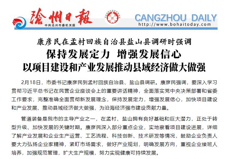 2月18日,沧州市委书记康彦民到访盐山县调研,重点考察盐山县管道装备这一主导产业。
